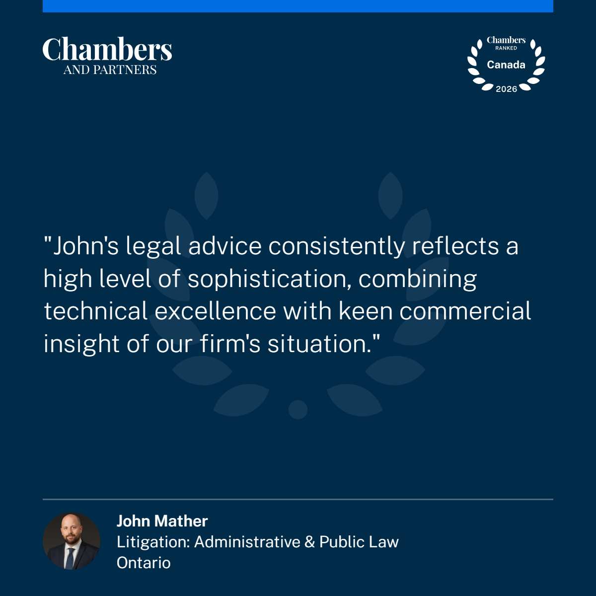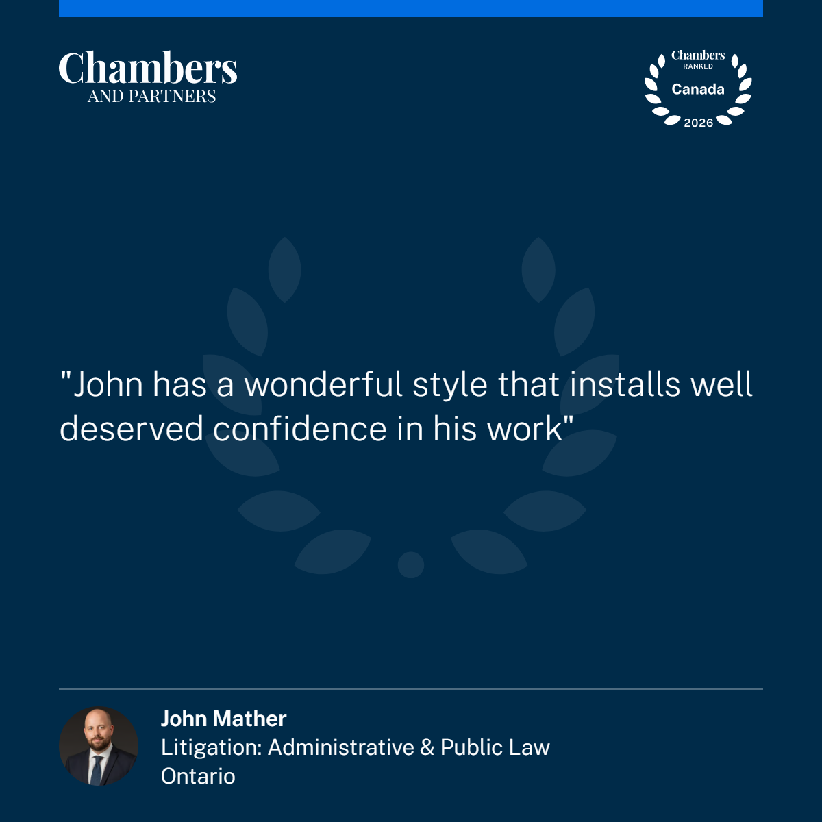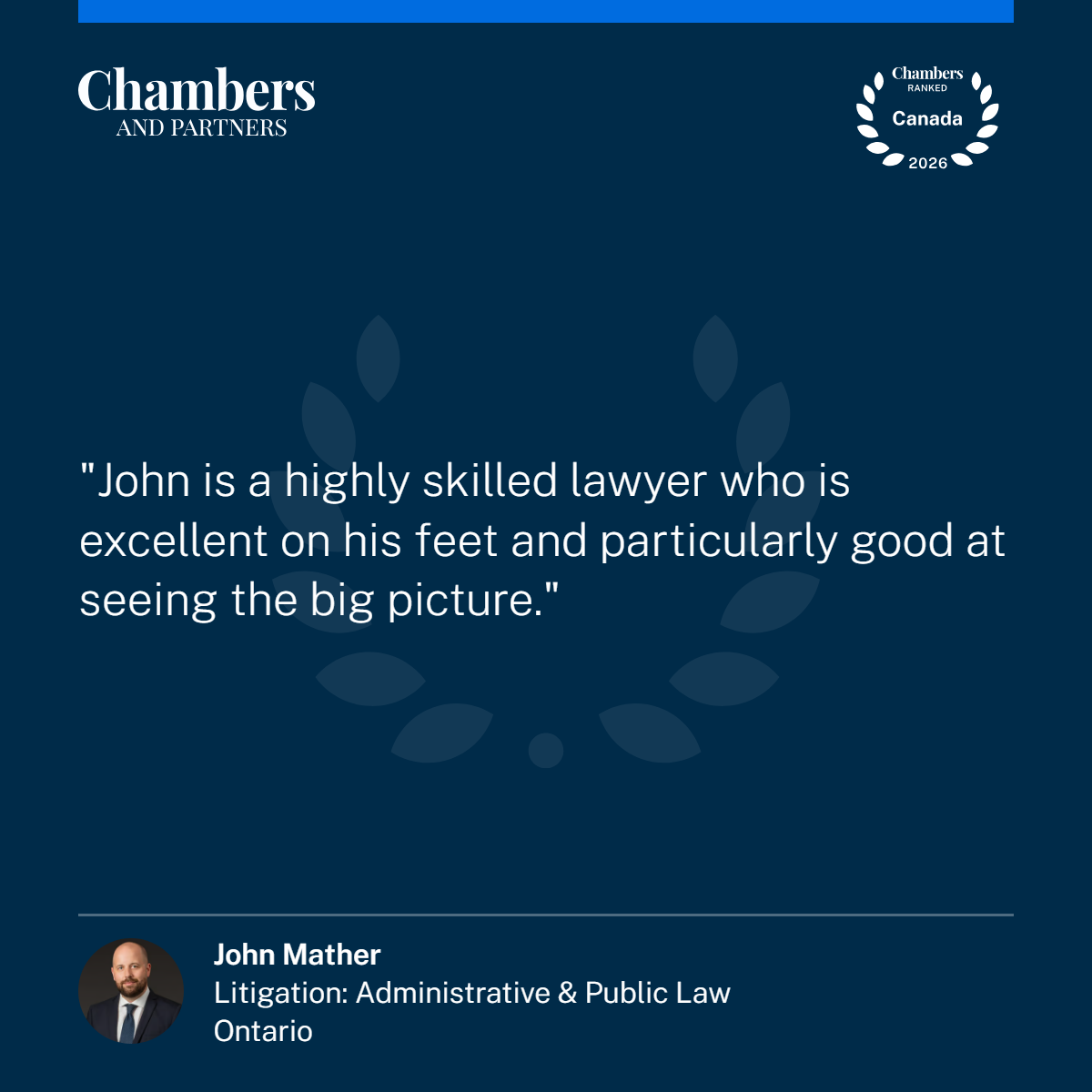 John is consistently recognized as a leading litigation lawyer in Canada. John’s Chambers and Partners ranking states that John is “held in high esteem for his litigation practice, with sources applauding his advocacy skills and courtroom pedigree in high-stakes commercial and public law disputes”. John is also regularly ranked and recognized by Lexpert and Benchmark Litigation.